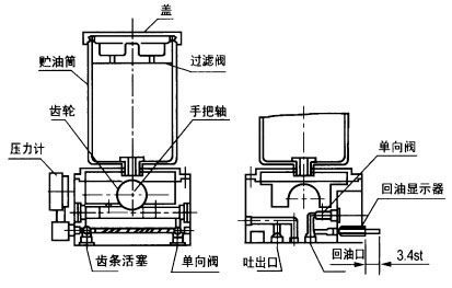手動潤滑泵是借人工擺動手把,通過齒輪帶動齒條活塞往復(fù)運(yùn)動實(shí)現(xiàn)向外供油的,當(dāng)活塞處于圖示極限位置時(shí),潤滑脂通過吸入口吸入并充滿活塞的右腔,當(dāng)活塞向右移動時(shí),被吸入的潤滑脂在油壓的作用下頂開單向閥壓送至出口向外排出,當(dāng)系統(tǒng)中主分配器的一計(jì)量油口返回至回油指示器的油量達(dá)到3.2mL時(shí),指示桿全部伸出,證明系統(tǒng)所有潤滑點(diǎn)已得到所需的潤滑油量,此時(shí)停止操作手把并把指示桿向內(nèi)壓進(jìn),為下循環(huán)準(zhǔn)備,指示器內(nèi)的潤滑脂經(jīng)單向閥返回貯油桶內(nèi)。