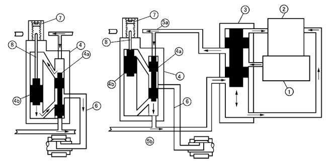 如上圖所示,由泵壓送來的潤滑脂,經(jīng)供油管5a輸送至分配器4,進入先導活塞4a上部加壓,將先導活塞4a壓下,此時下部與供油管5b連通卸荷。隨著先導活塞4a的下移,使主活塞4b上腔與先導活塞上腔連通,主活塞下腔與出油口連通,供送的潤滑劑進入主活塞上腔,推動主活塞下移,將其下腔的潤滑劑經(jīng)給油管6壓送到潤滑點,完成第一周期的給油動作。