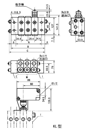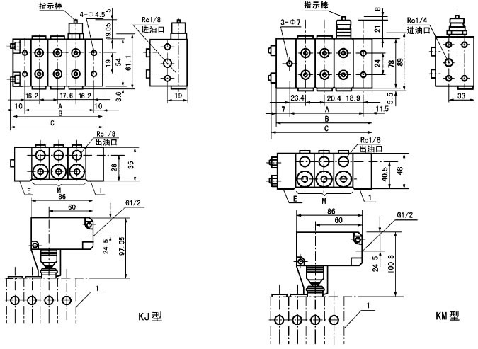 KJ、KM、KL系列單線遞進(jìn)式分配器,它由中碳合金結(jié)構(gòu)鋼制造的供給體、端部體和3~8片根據(jù)設(shè)計(jì)需要所確定的給油量和出油口數(shù)的中間體組合而成。分配器的正常出口設(shè)置于分配器的兩側(cè)面,在上面還設(shè)置有預(yù)備出口,各中間體的出油口內(nèi)均裝有止回閥,能徹底防止因潤(rùn)滑點(diǎn)背壓作用而產(chǎn)生潤(rùn)滑脂的逆流,保證了各出油口的給油量定量、準(zhǔn)確。