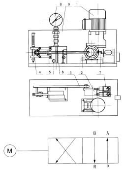 電動機(jī)經(jīng)蝸輪蝸桿減速后,由偏心輪2帶動連桿3 作直線往復(fù)運(yùn)動。由于連桿末端所連動的彈簧機(jī)構(gòu)4的作用,使二位四通閥5中的滑芯桿6產(chǎn)生急速的推拉動作,從而改變二位四通閥各油口的聯(lián)接方式,達(dá)到液流換向的目的。此時,偏心輪旋轉(zhuǎn)了180°到達(dá)另一個死點(diǎn)位置,觸動了限位開關(guān)7。限位開關(guān)即可送出脈沖信號,停止閥電機(jī)運(yùn)行,完成了一個工作過程。壓力表8裝于防護(hù)罩9頂部用于監(jiān)視閥內(nèi)的工作壓力。