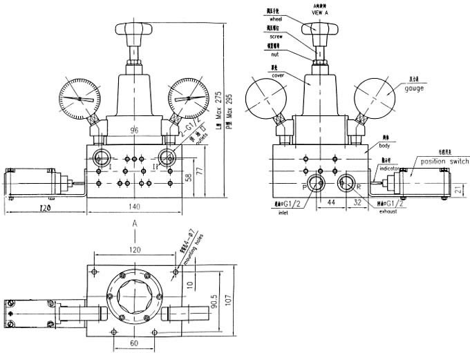 本閥為二位四通自動液壓換向閥,上平面設(shè)有兩塊壓力表和調(diào)壓手輪。換向壓力由手輪調(diào)節(jié),順時針壓力升高,反之壓力降低。本閥門進油口P與泵出油口連接,回油口R接貯油桶,供油口Ⅰ、Ⅱ分別與兩條供油管路連接。工作時當(dāng)Ⅰ路油壓達設(shè)定壓力,換向閥自動切換到Ⅱ路,這樣潤滑泵就能循環(huán)往復(fù)地向兩條管路供送潤滑脂。