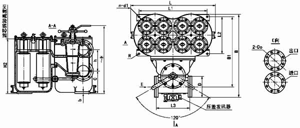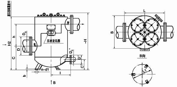 | 法蘭標(biāo)準(zhǔn):GB573-65(可根據(jù)需要確定):DN100、150-3 組濾芯組件 DN200-4 組濾芯組件;壓差發(fā)訊器為選配件。 |