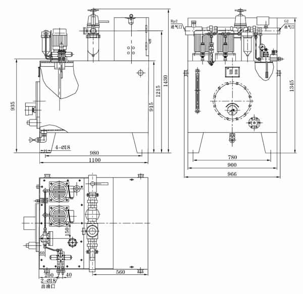 該站主要由油箱(帶電加熱器、液位計(jì)、電接點(diǎn)溫度計(jì)、空氣濾清器、液位控制器)、兩臺高壓油泵裝置(一備一用)、溢流閥、電磁閥、過濾器、壓力控制器以及氣動三聯(lián)件和PLC電氣控制柜等組成。在電動機(jī)的牽引下油泵工作,從油箱內(nèi)吸入潤滑油加壓排出,途徑單向閥、過濾器和三位四通電磁閥后向雙線系統(tǒng)管線供送。正常工作時,一臺高壓油泵常開工作,另一臺備用,可通過電氣轉(zhuǎn)換開關(guān)來選擇使用,并可通過按鈕開關(guān)人工啟動和停止油泵。PLC電氣控制箱對油氣系統(tǒng)實(shí)行程序化全自動控制,還可向主控室提供系統(tǒng)“運(yùn)行”、“停止”、“故障”等遠(yuǎn)程信號接口。