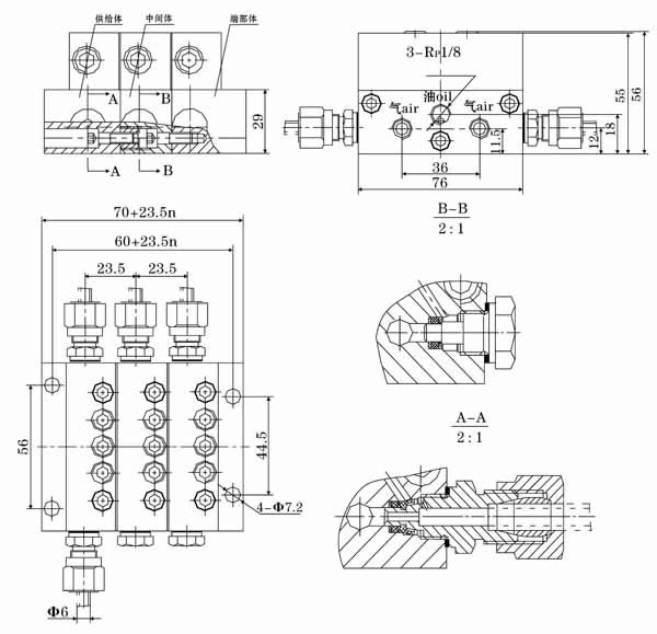 SMX*-YQ型油-氣分配混合器,是由模塊式的單線遞進分配器和混合器組合疊加而成。設(shè)有一個進油口,二個進氣口,3~16個油氣出口。適用于單線二分式油氣潤滑系統(tǒng)和雙線-遞進式油氣潤滑系統(tǒng)中。