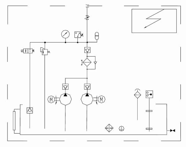 正常工作時,一臺高壓油泵常開工作,另一臺備用,可通過電氣轉(zhuǎn)換開關(guān)來交替使用,并可通過按鈕開關(guān)人工啟動和停止油泵,PLC電氣控制箱對油氣系統(tǒng)實行程序化全自動控制,還可向主控室提供系統(tǒng)“運(yùn)行”、“停止”、“故障”等遠(yuǎn)程信號接口。